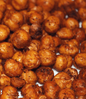 The second bit was the chickpeas. I’d seen for a while how you can roast chickpeas in the oven to make a snack, kind of in lieu of nuts I guess. You just take the canned, drained, rinsed chickpeas (I used two cans, just of basic, cheap ones) and coat them in spices (I used paprika and cumin; am not a fan of too much heat), and you then roast (I used a few splatters of oil) for half an hour or so around 200 degrees.