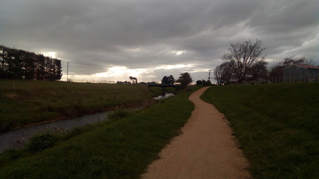 Having left the road for a bit, I traipsed along the path by the stream and debated the sense of leaving home for an hour without an umbrella as the sky looked dodgy for a spell, Then it cleared and it would have been a nice spot to have taken a snack, a thermos of coffee, like in the olden days, and the book, and plonked down on the grass (on a tartan rug, if I owned one) and read for a bit.